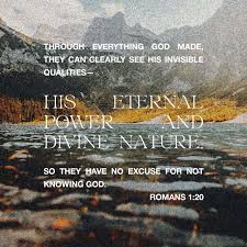 Romans 1:20 (NLT) 20For ever since the world was created, people have seen the earth and sky. Through everything God made, they can clearly see his invisible qualities—his eternal power and divine nature. So they have no excuse for not knowing God. |